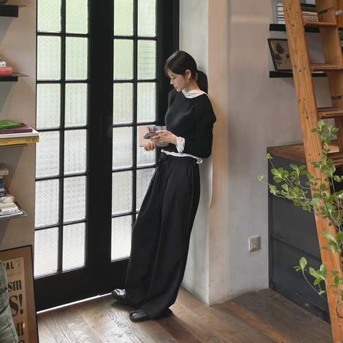 时尚感觉的裤子。整体上是宽松垂落的版型和细褶细节演绎出舒适又显瘦的曲线。可以用正面纽扣和拉链开关内置的松紧带根据尺寸调节腰部稳定地抓住,提供舒适的活动性。用长衣长展现修长的腿部线条和各种上衣单品搭配也很好搭配的颜色构成,积极推荐。自然收尾的细节,有自然的开线现象,请参考。