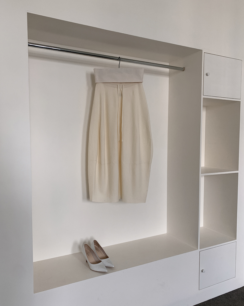 허리는 밴딩과 스트링 디테일로 안정감 있게 잡아